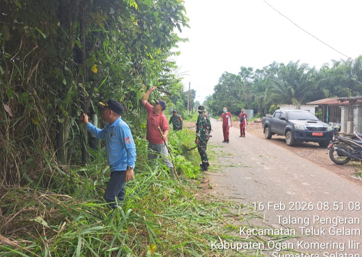 SIKLUSNEWS.COM. PEDAMARAN – Forum Koordinasi Pimpinan Kecamatan (Forkopimcam) Pedamaran bersama unsur pemerintah kecamatan, desa, TNI-Polri, warga Persaudaraan Setia Hati Terate ( PSHT) serta masyarakat melaksanakan aksi bersih-bersih dan melakukan penebangan tanaman liar disepanjang jalur jalan raya Simpang Kyai hingga ke Jembatan OPT Kecamatan setempat Kabupaten OKI Provinsi Sumsel, Senin (16/2/26).