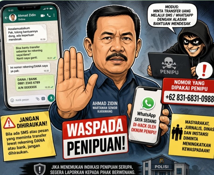 Kali ini, modus penipuan digital mencatut nama wartawan senior Kabupaten Karawang, Ahmad Zidan, setelah akun WhatsApp miliknya dilaporkan diretas oleh oknum tidak bertanggung jawab.