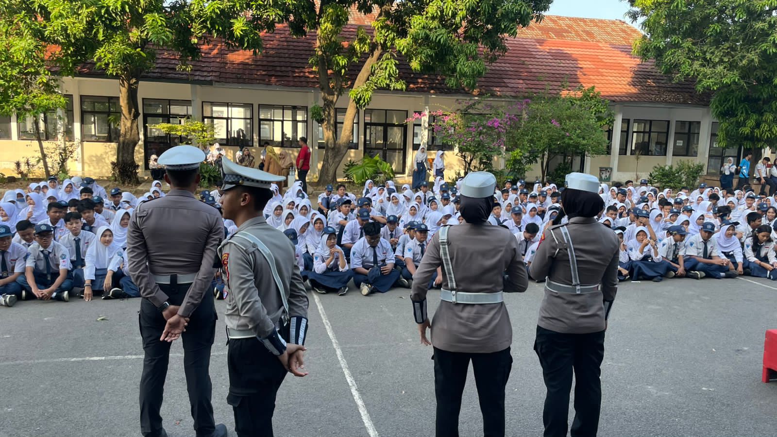 Kanit Kamsel Satlantas Polres Karawang, Ipda Angga Mas Bani, beserta personel melaksanakan kegiatan Police Goes to School di SMPN 5 Karawang Barat, Kabupaten Karawang, Rabu (29/4/2026).